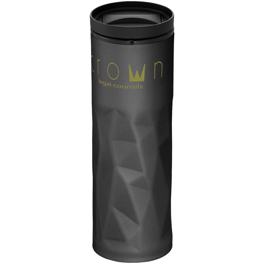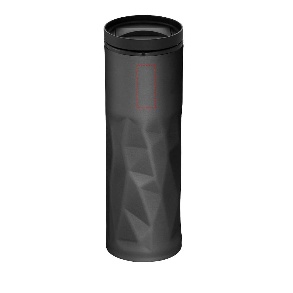 Dubbelwandig geïsoleerde beker met deksel en schuifvergrendeling. Inhoud 450 ml.