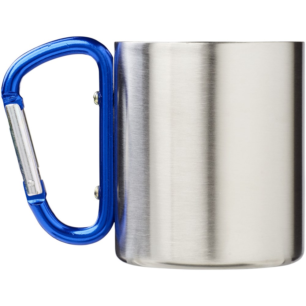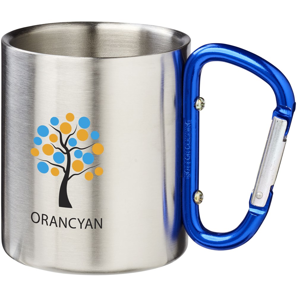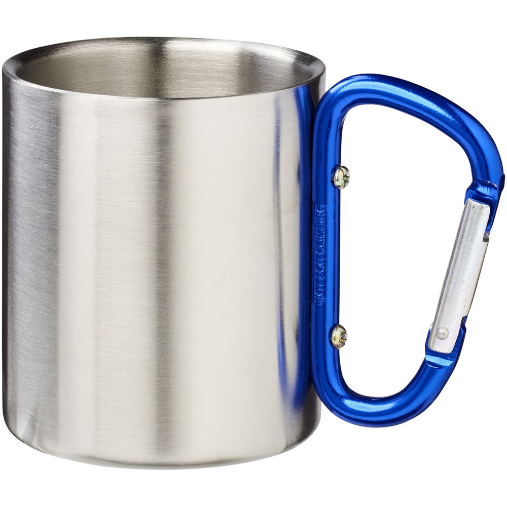 Geïsoleerde beker van roestvrij staal met groot handvat in de vorm van een karabijnhaak. Ideaal voor kampeerders en outdoor liefhebbers. Inhoud 200 ml.