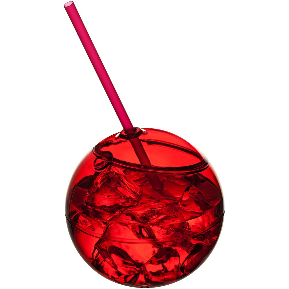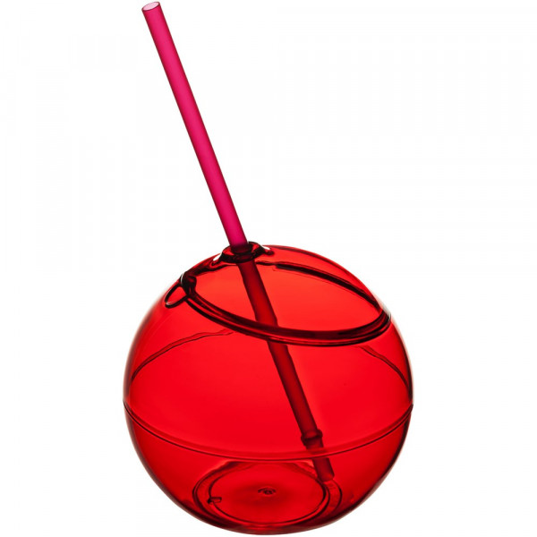 Enkelwandige beker in de vorm van een bal met klikdeksel en bijpassend rietje. Inhoud 580 ml.