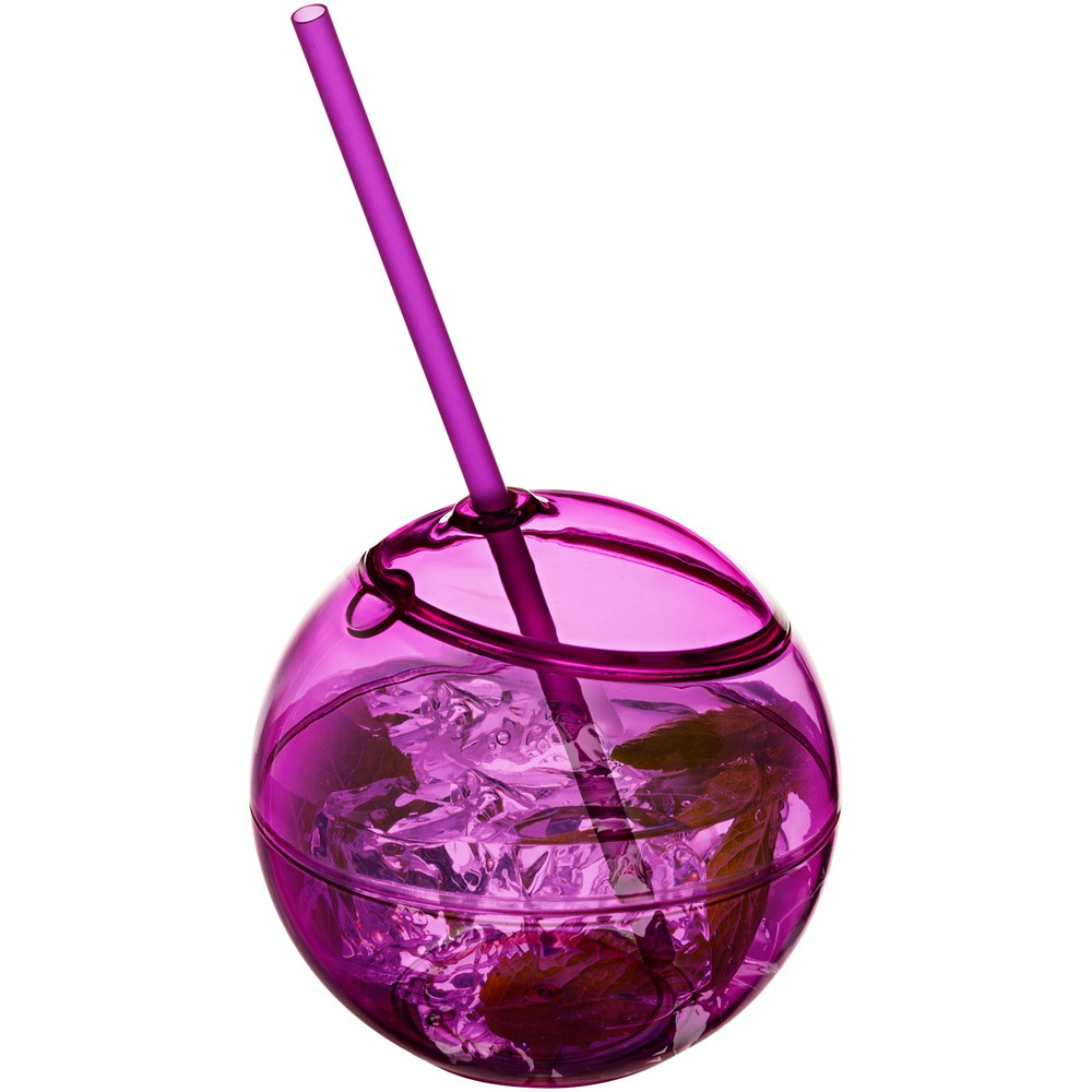 Enkelwandige beker in de vorm van een bal met klikdeksel en bijpassend rietje. Inhoud 580 ml.