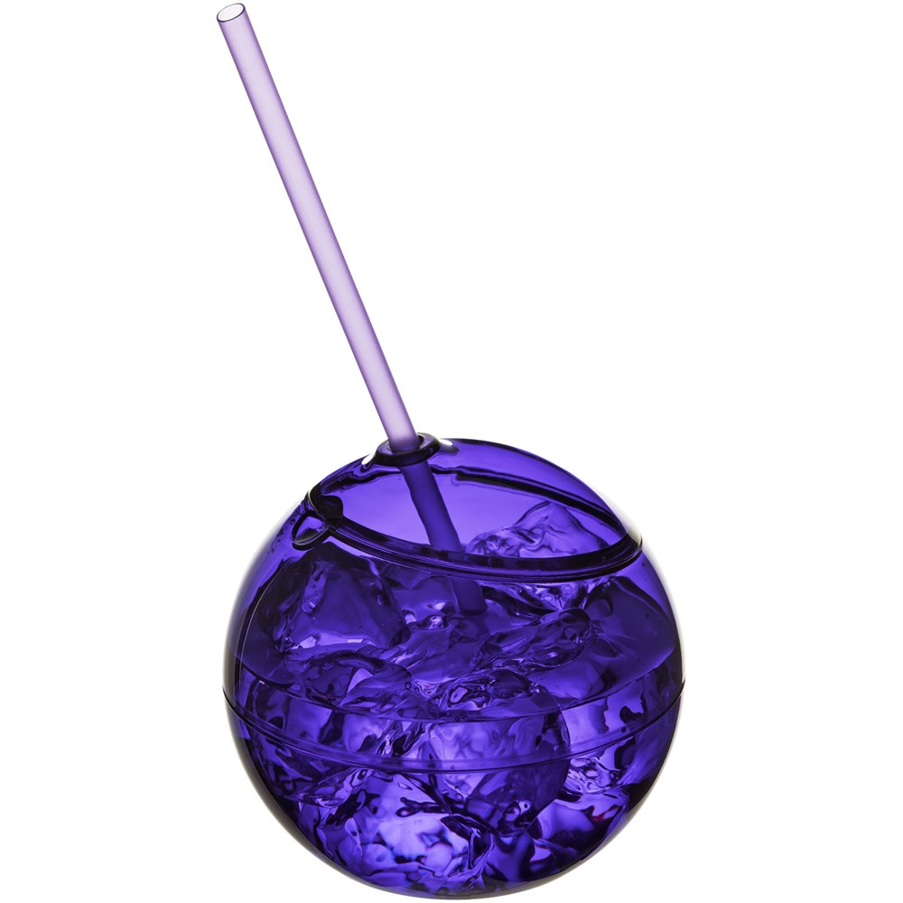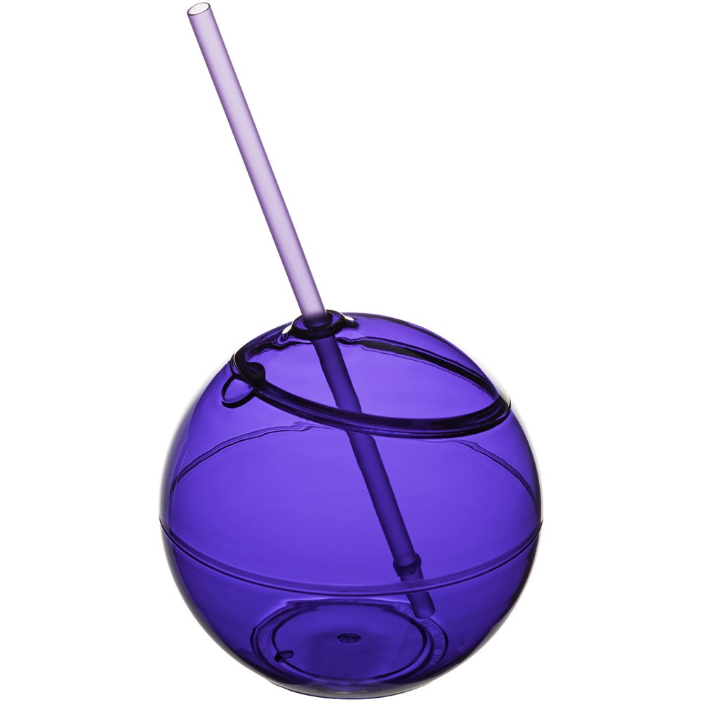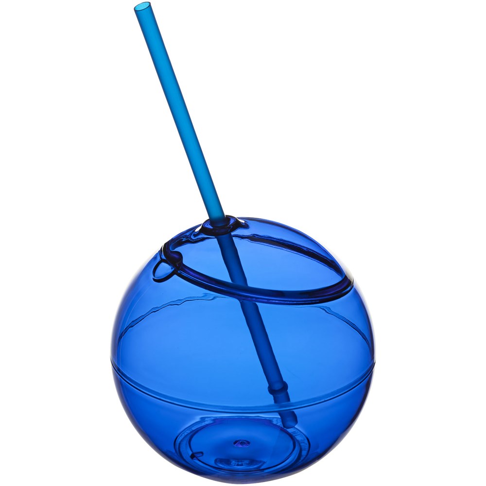 Enkelwandige beker in de vorm van een bal met klikdeksel en bijpassend rietje. Inhoud 580 ml.