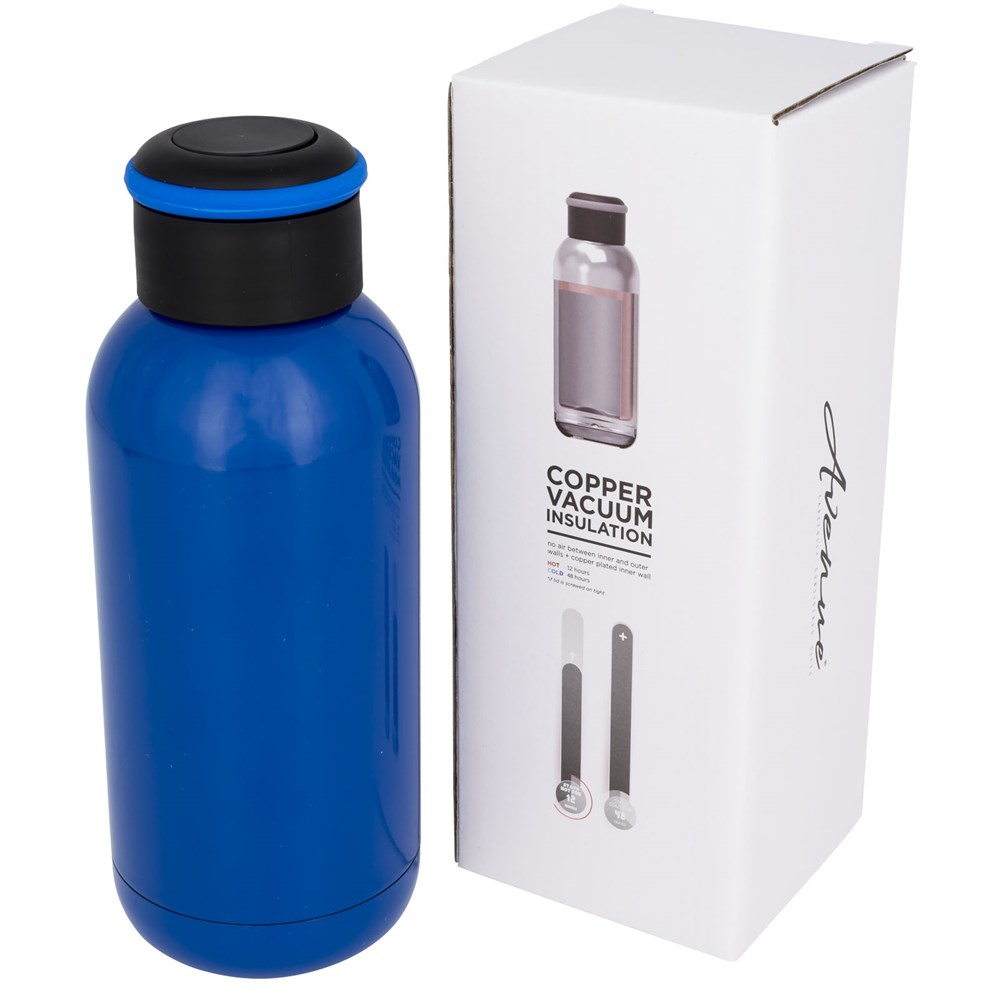 Fles is van dubbelwandig roestvrij staal met vacuümisolatie. Binnenwand is bekleed met koper voor ultieme geleidbaarheid om dranken 8 uur warm en 48 uur koud te houden. Schroefdop met ingebouwde siliconenband. Brede opening voor gemakkelijk reinigen en vullen. Capaciteit is 350ml. Gepresenteerd in een Avenue geschenkverpakking.