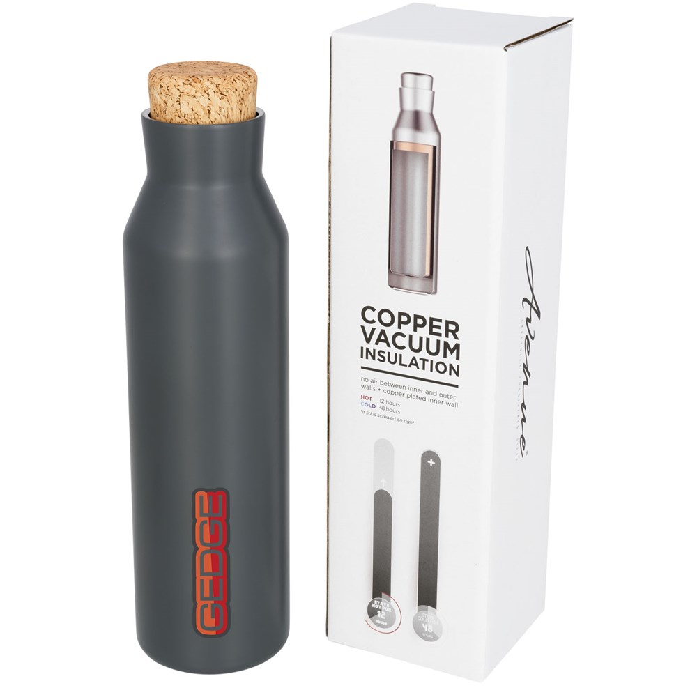 Duurzame, dubbelwandige roestvrijstalen koper vacuüm geïsoleerde drinkfles, waardoor je drank 12 uur lang warm en 48 uur lang koud blijft. De constructie voorkomt ook condensatie aan de buitenkant van de fles en het deksel is bestand tegen morsen. Voorzien van een innovatief schroefdeksel met kurk-look. Past op de meeste standaard bekerhouders voor auto's. Inhoud 590ml. Geleverd in een Avenue geschenkverpakking.