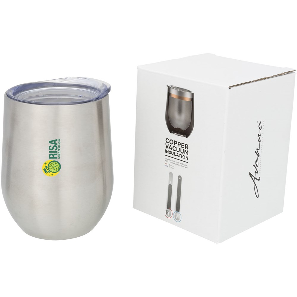 De Corzo koper vacuüm geïsoleerde beker heeft een dubbelwandige vacuümconstructie met koper isolatie, waarin uw drankje 6 uur warm en 24 uur koud blijft. De constructie voorkomt condensatie aan de buitenkant van de beker. Eenvoudige klikdop voor gemakkelijk drinken. Met spraypoedercoating op de buitenkant. Brede opening voor comfortabel vullen en schenken. Capaciteit is 350 ml. Gepresenteerd in een Avenue geschenkverpakking.