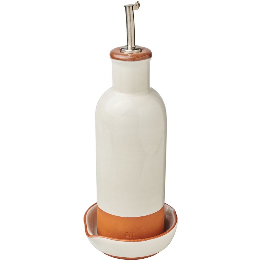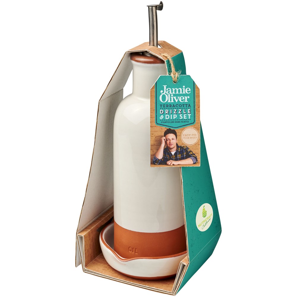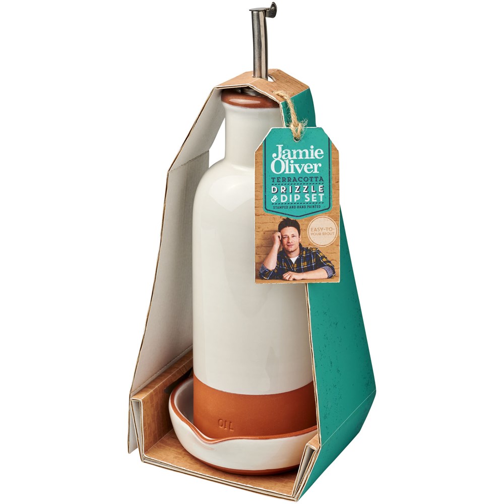 Terracotta drizzler en dip set. Met de hand geschilderde en gestempelde drizzler en dip set. De drizzler is ideaal voor het garneren van salades en soepen, en de bijpassende rustieke kom (4 cm x Ø 10 cm) is perfect om brood in te dippen. Terracotta, keramiek en roestvrij staal.