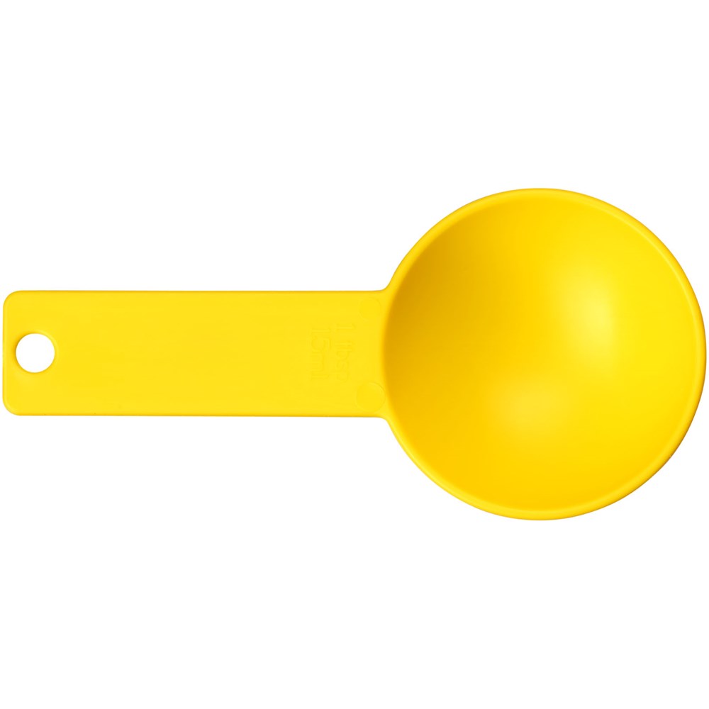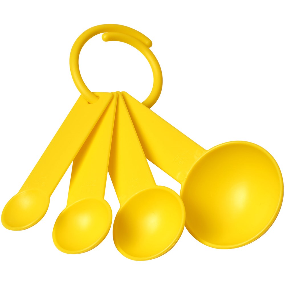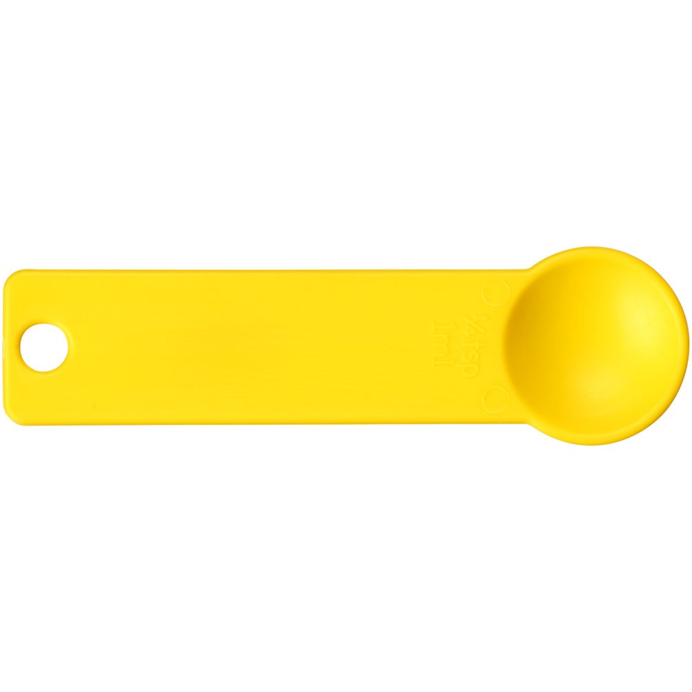 Een set van vier maatlepels, allemaal bevestigd aan een ring. De set bestaat uit 1/4 theelepel, 1/2 theelepel, 1 theelepel en 1 eetlepel. Verkrijgbaar in diverse kleuren.
