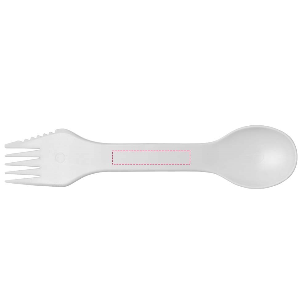 Een gecombineerde vork en lepel met snijvlak die geweldig is voor op de camping, festival of tijdens picknicks en andere buitenactiviteiten.