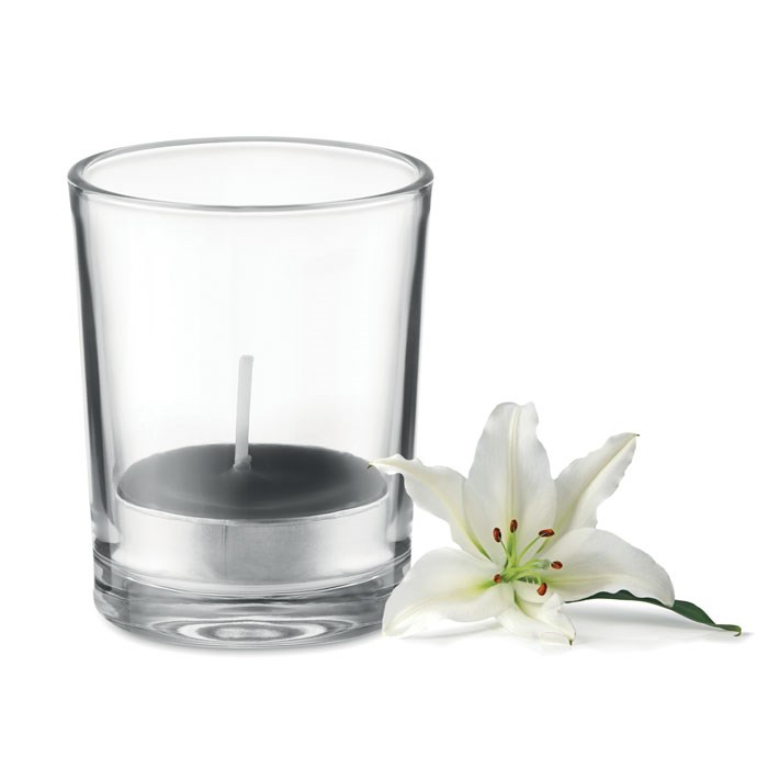 Gekleurd geurkaarsje in glazen houder.
