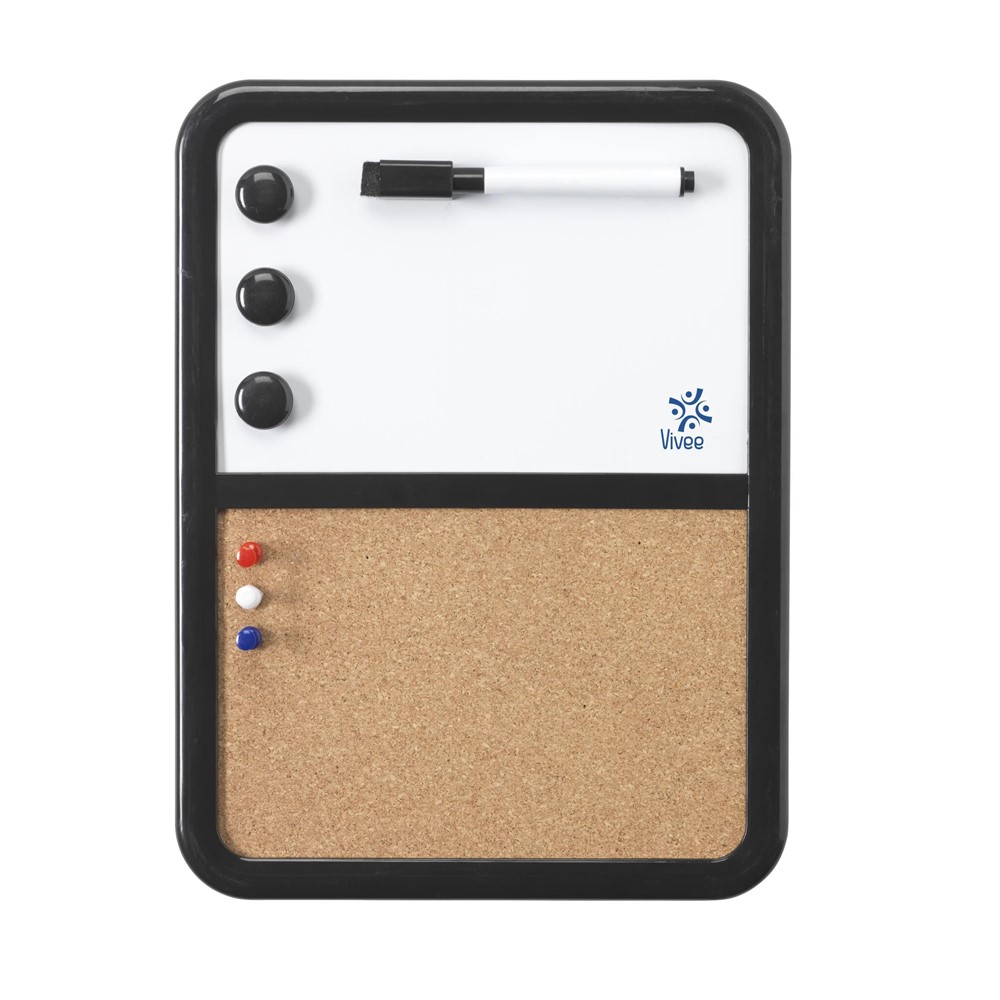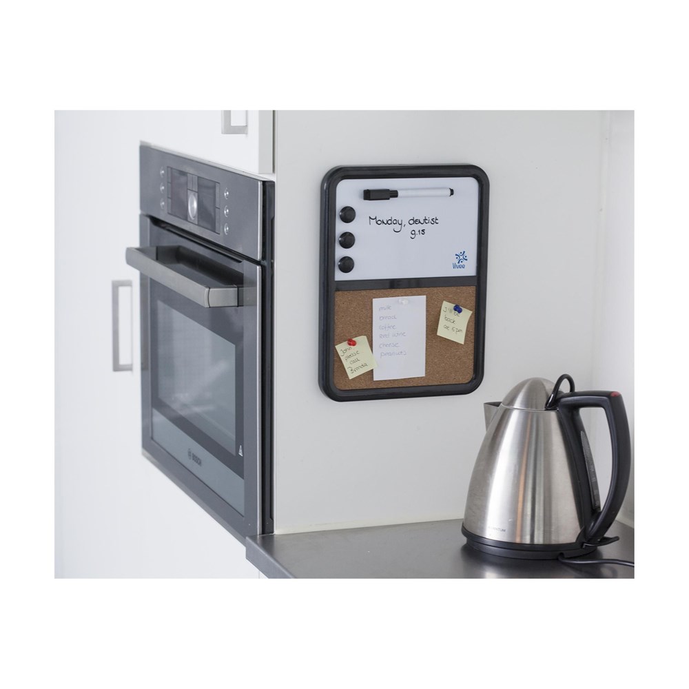 Whiteboard en prikbord met een toplaag van kurk. In een kunststof omlijsting met ophangoog. Incl. 3 magneten, 3 pins en een markeerstift met wisser. Per stuk in doos.
