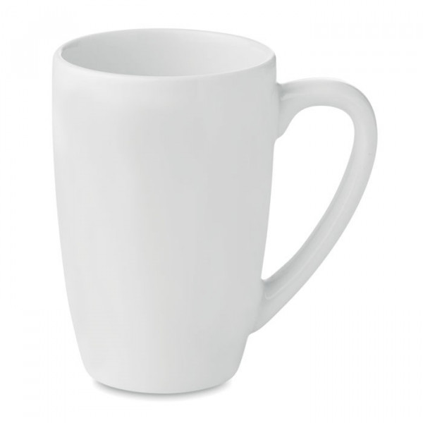 Keramische mok. 300 ml. Per stuk verpakt in een wit kartonnen doosje. Tampondruk is niet vaatwasserbestendig. Keramisch transfer is vaatwasserbestendig.
