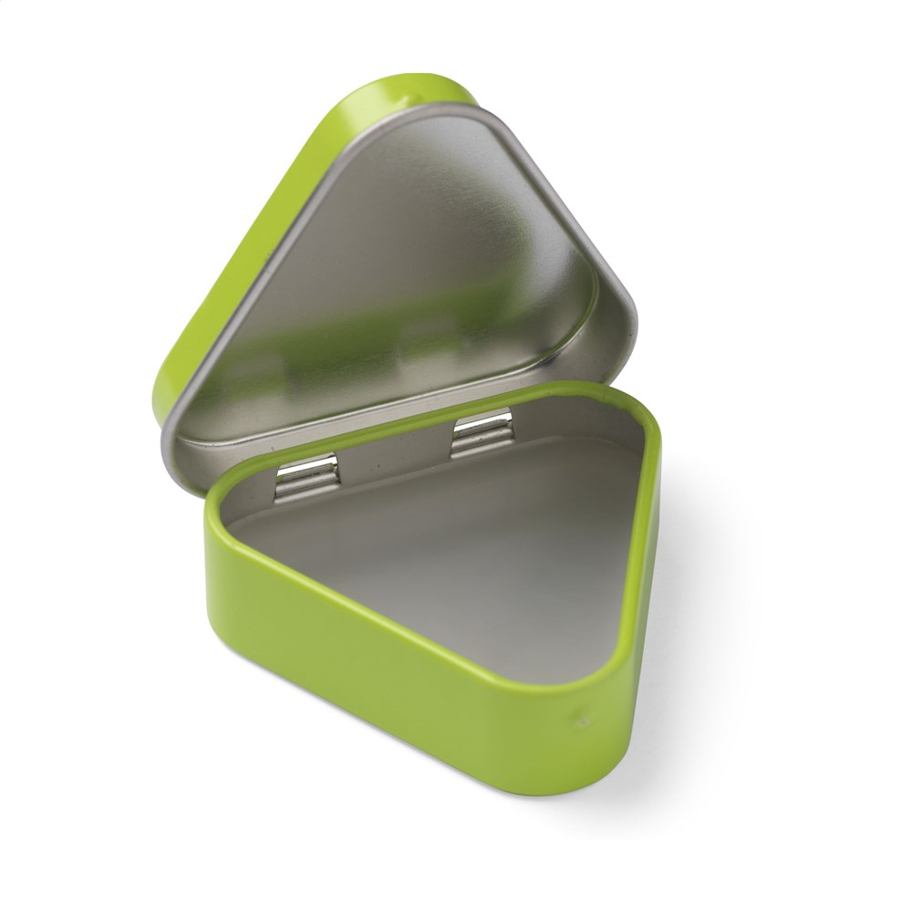 Lippenbalsem in een driehoekig, aluminium blikje met scharnierdeksel. Geen Sun Protection Factor....meer