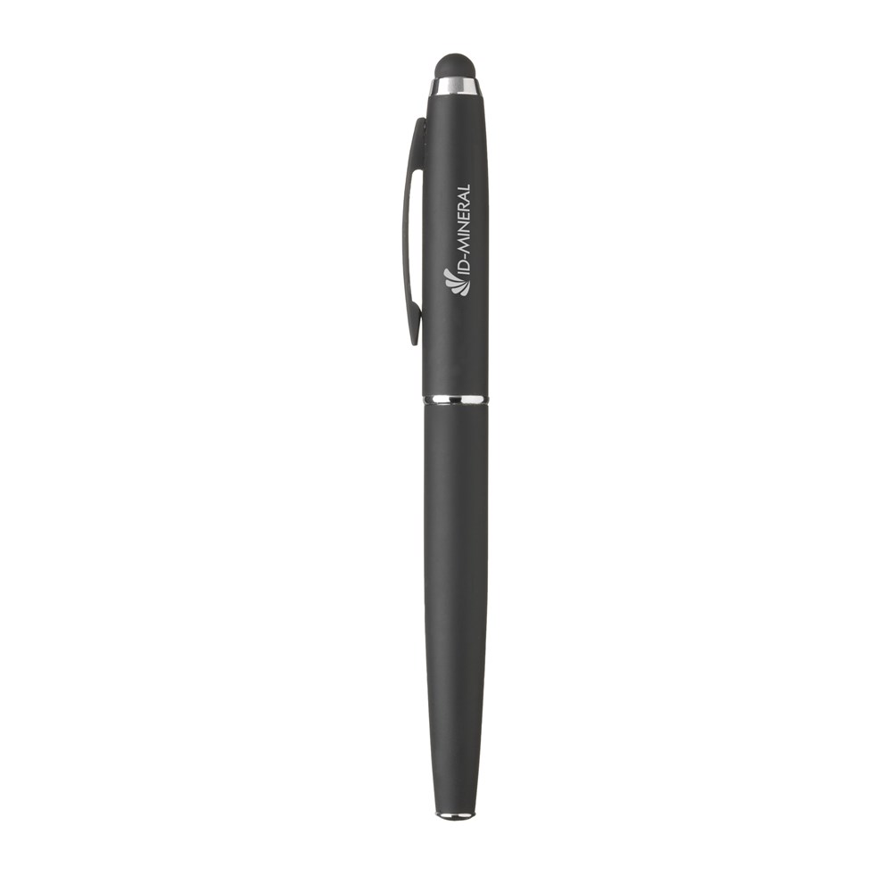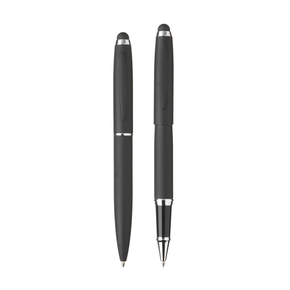 Chique, metalen schrijfset: blauwschrijvende balpen met draaikliksysteem. Rollerpen met blauwe, sneldrogende inkt. Beide met stijlvolle rubberized finish, rubberen top/pointer, clip en hoogglans accenten. Geef uw geschenk meer karakter met één van onze stijlvolle geschenkverpakkingen.