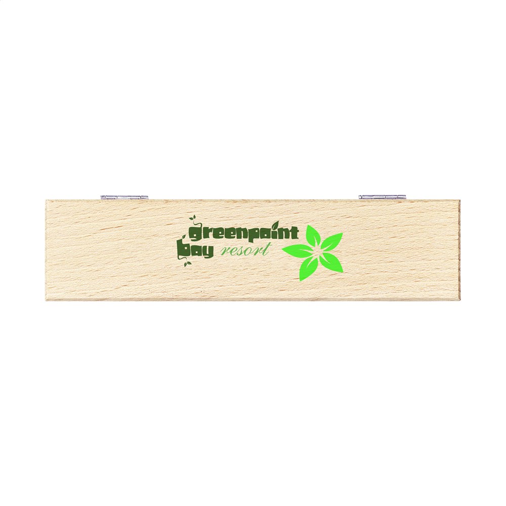Schrijfset van massief beukenhout: blauwschrijvende balpen en vulpotlood met 3 HB vullingen (0,5 mm). Met verchroomde clip, drukknop en puntstuk. In beukenhouten cassette.