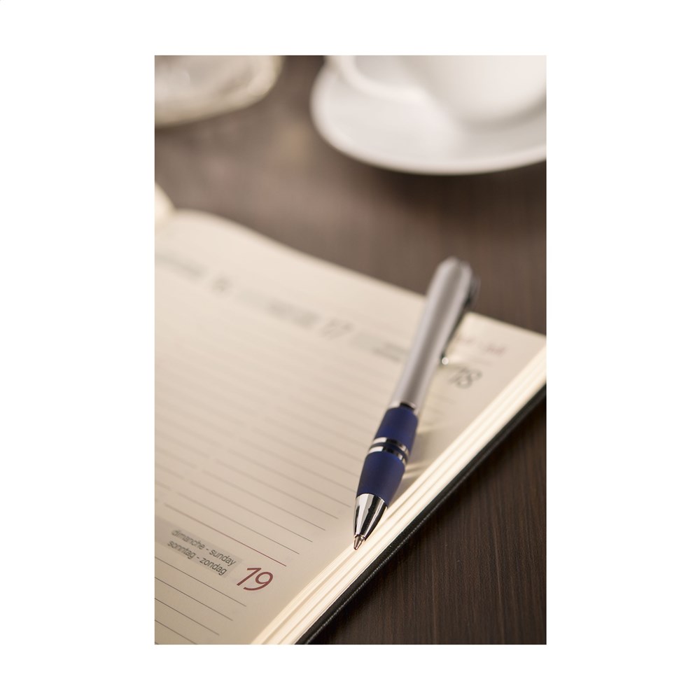 Blauwschrijvende balpen met gripvast voorstuk en metalen clip.