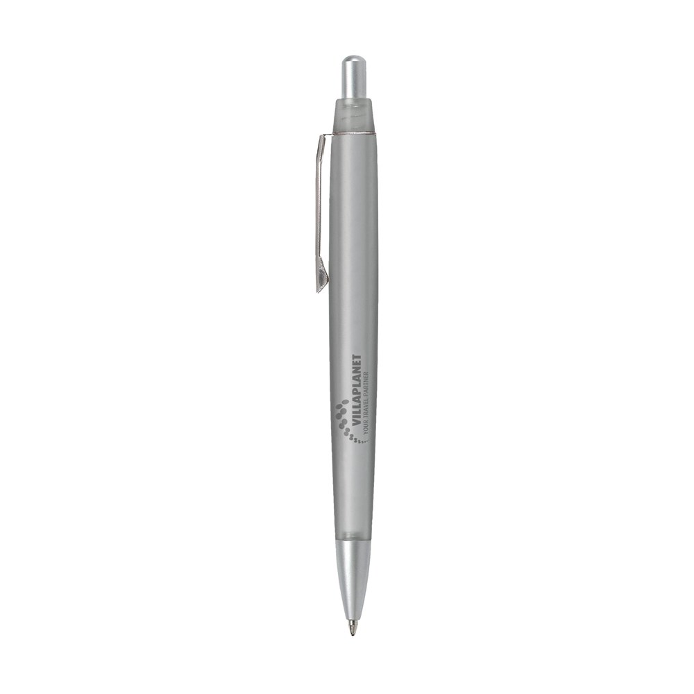 Blauwschrijvende balpen met mattransparantgekleurde houder, matmetalen clip, puntstuk en drukknop.meer
