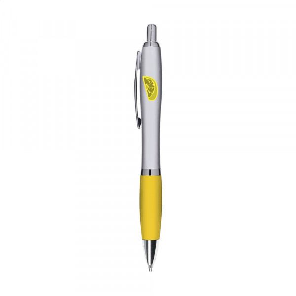 Blauwschrijvende óf zwartschrijvende balpen met gekleurd, gripvast voorstuk en metalen clip.
