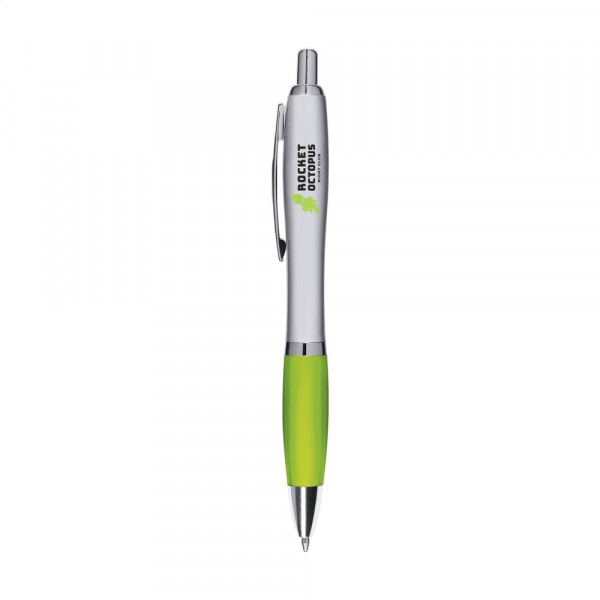 Blauwschrijvende óf zwartschrijvende balpen met gekleurd, gripvast voorstuk en metalen clip.