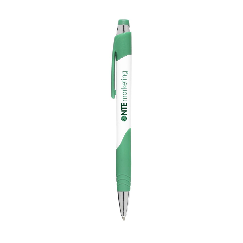 Blauwschrijvende balpen met gripvast, rubberen voorstuk, solide, gekleurde clip en zilverkleurige accenten.