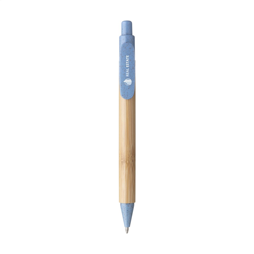 Blauwschrijvende balpen met bamboe houder. De clip, drukknop en het puntstuk zijn van tarwestro. Nagenoeg geheel afbreekbaar. Een ecologische verantwoorde keuze.