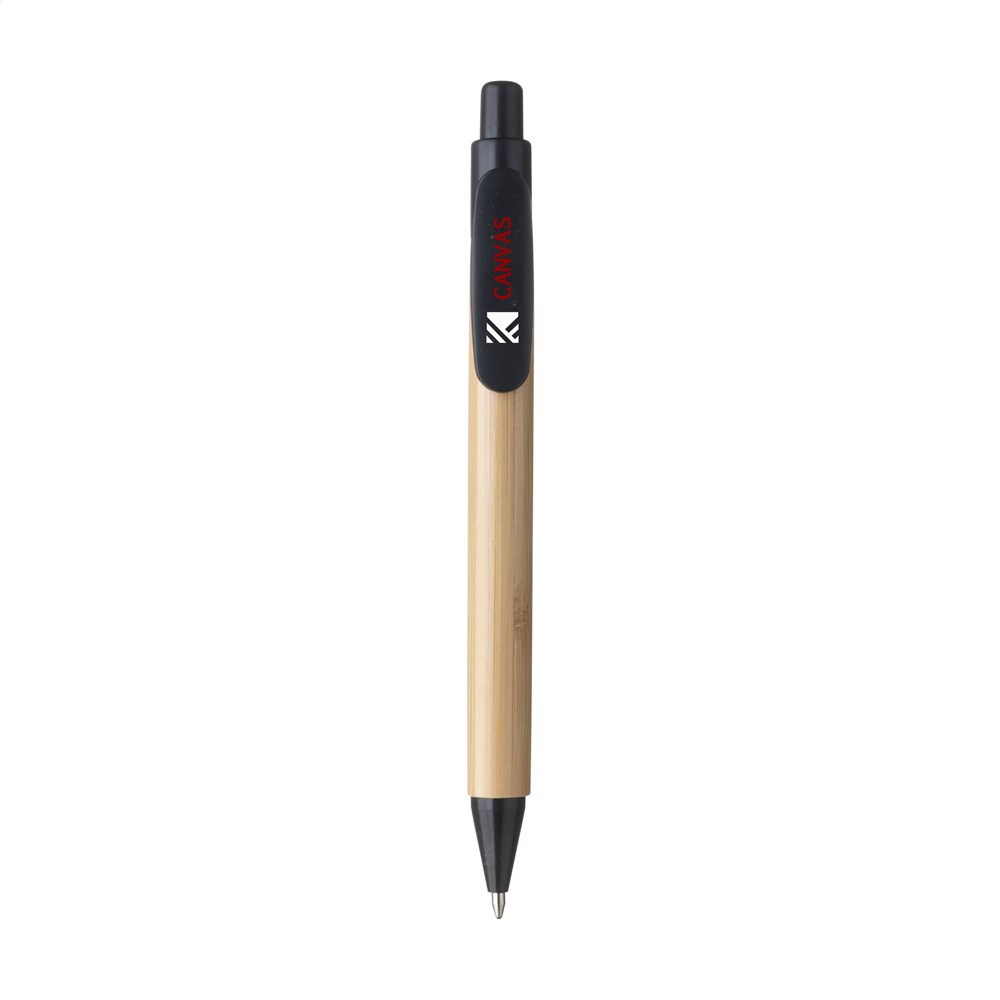 Blauwschrijvende balpen met bamboe houder. De clip, drukknop en het puntstuk zijn van tarwestro. Nagenoeg geheel afbreekbaar. Een ecologische verantwoorde keuze.