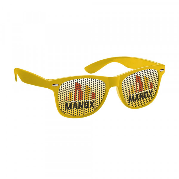 Opvallende promotiebril. Met UV 400 bescherming (volgens Europese normen). Te voorzien van full colour sticker op beide glazen.