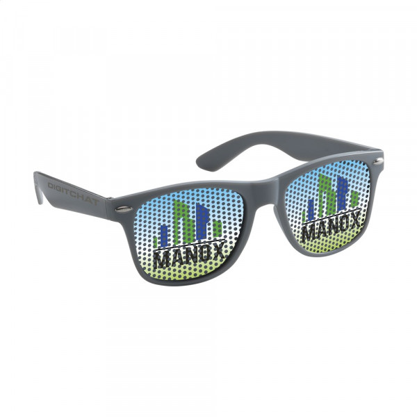 Opvallende promotiebril. Met UV 400 bescherming (volgens Europese normen). Te voorzien van full colour sticker op beide glazen.