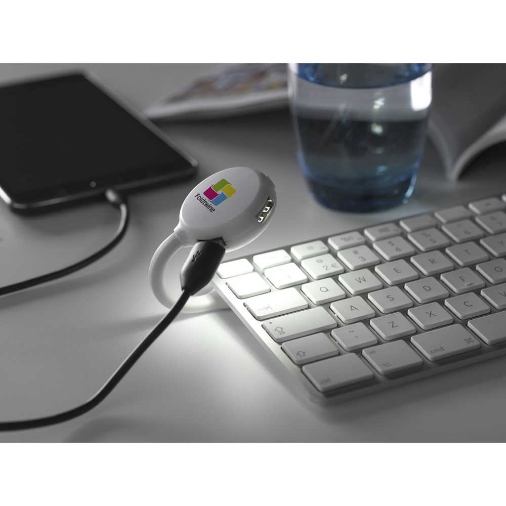 Multifunctionele 2.0 USB HUB met buigbaar leeslampje, voorzien van 5 energiezuinige LED-lampjes en 4 USB-poorten. Geschikt voor laptops met USB aansluiting.
