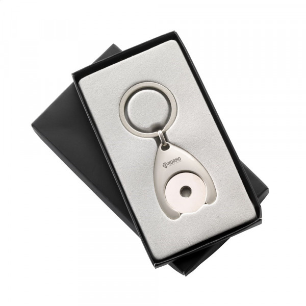 Sleutelhanger met stalen munthouder incl. winkelwagenmunt. Per stuk in doosje.
