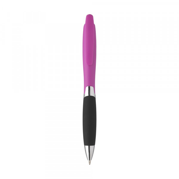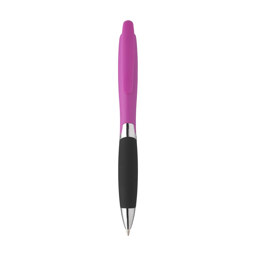 Stijlvolle, blauwschrijvende balpen met gripvast voorstuk, clip/drukknop en zilverkleurige accenten.meer
