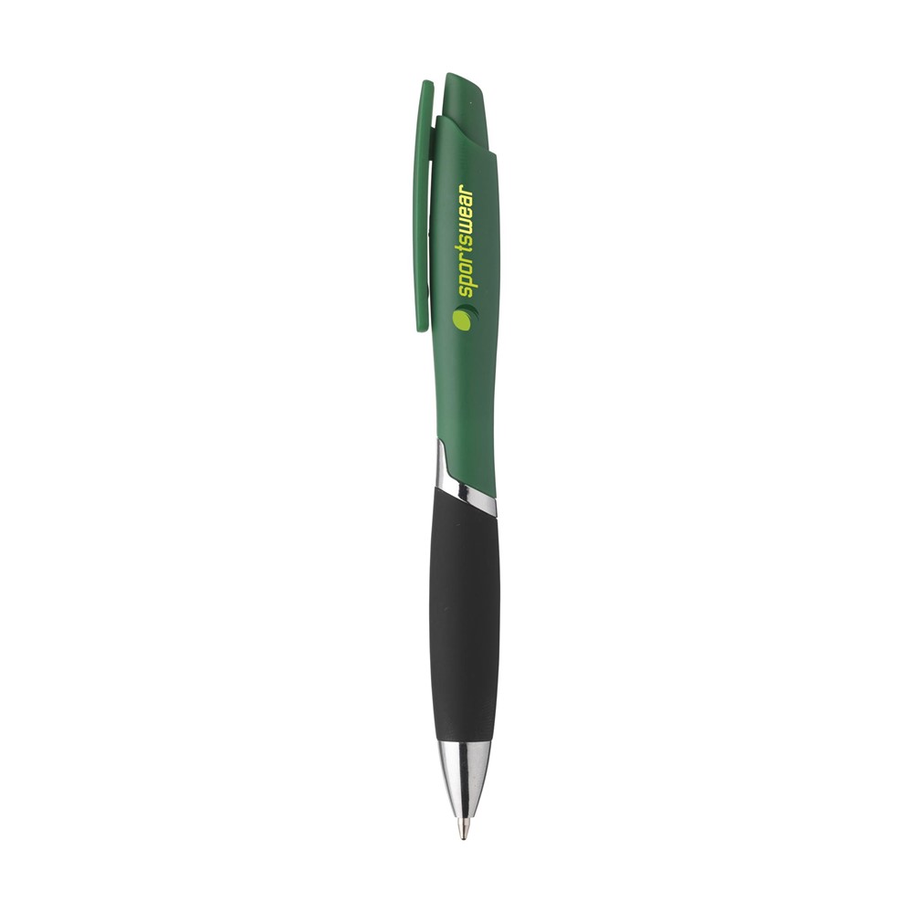 Stijlvolle, blauwschrijvende balpen met gripvast voorstuk, clip/drukknop en zilverkleurige accenten.meer