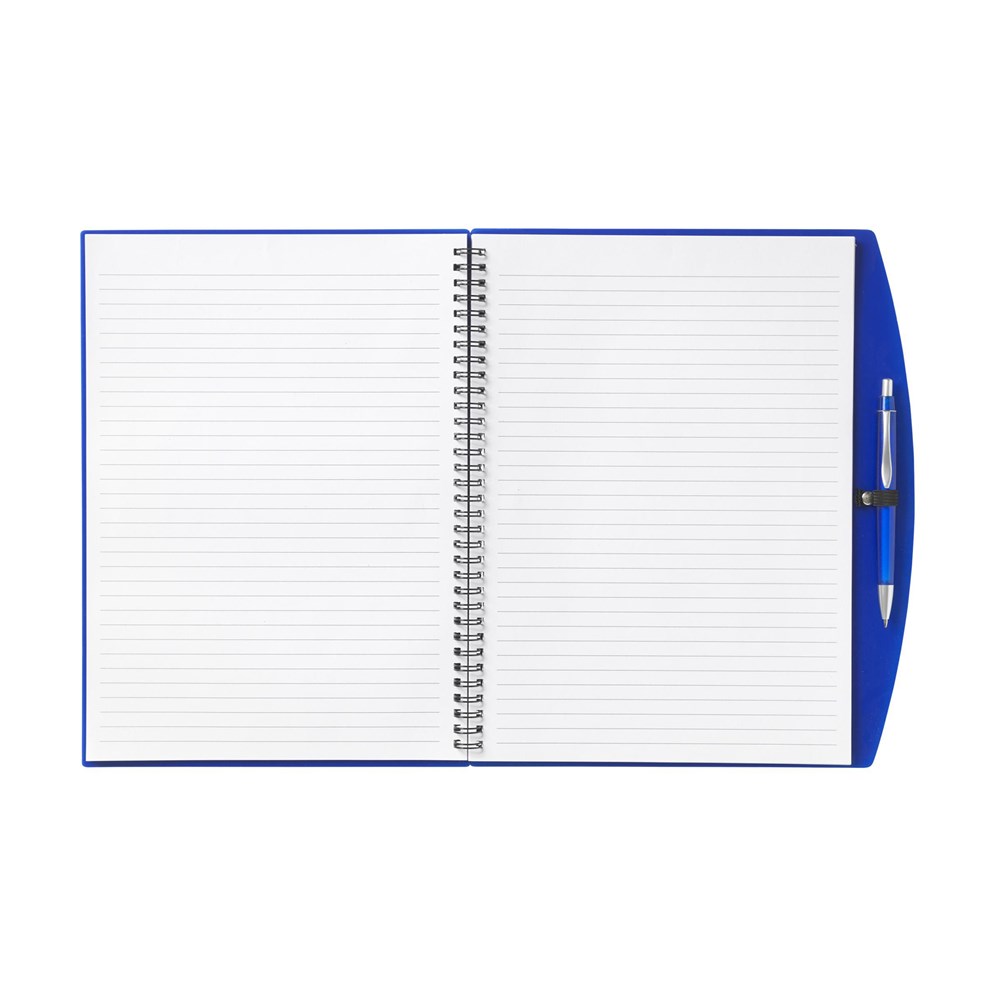 Notitieboek met ca. 70 velletjes gelinieerd schrijfpapier en transparant kunststof omslag, gebonden in metalen wire-o-binding. Incl. blauwschrijvende balpen.