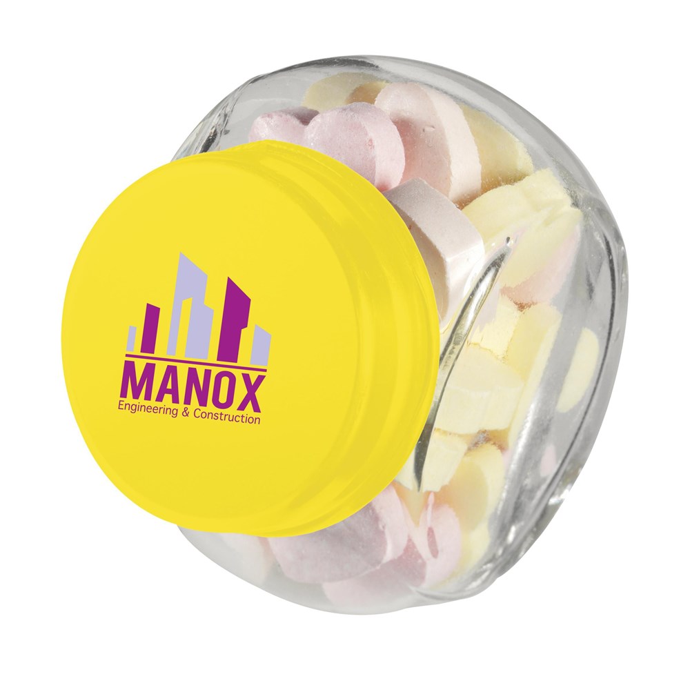 Glazen potje met ca. 30 g snoepjes. Keuze uit pepermunt, chocolade, jellybeans en hartjes.