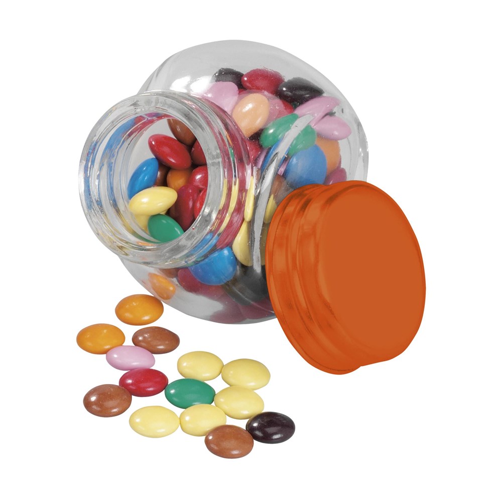 Glazen potje met ca. 30 g snoepjes. Keuze uit pepermunt, chocolade, jellybeans en hartjes.