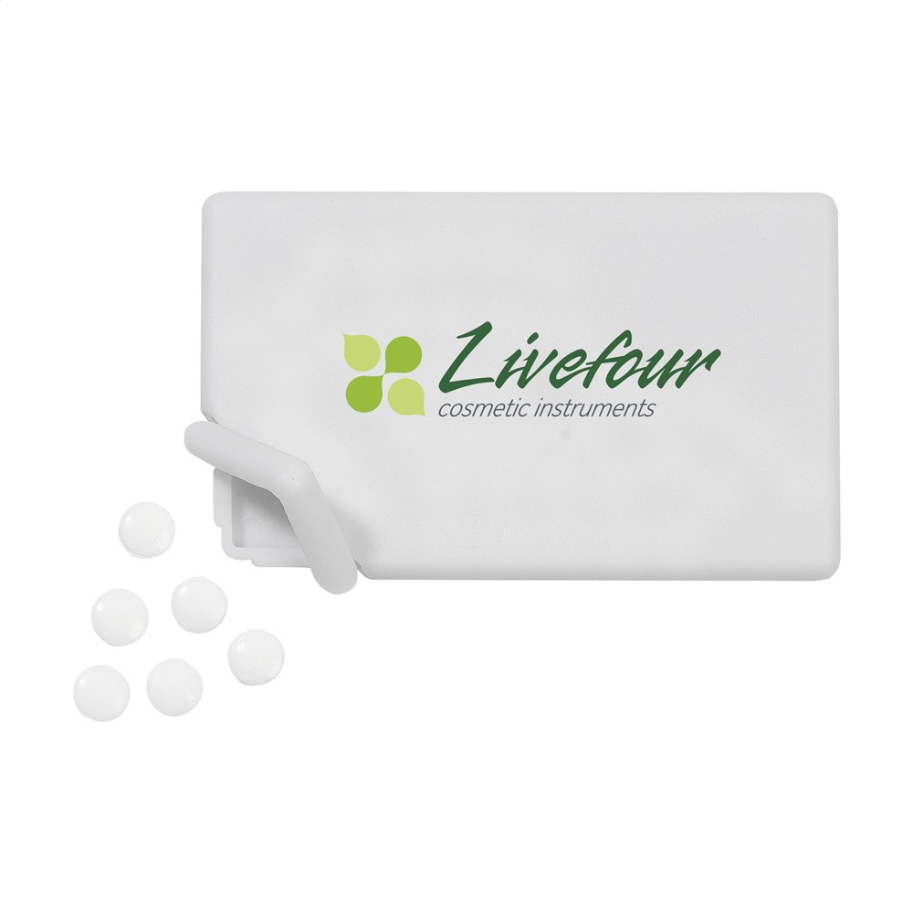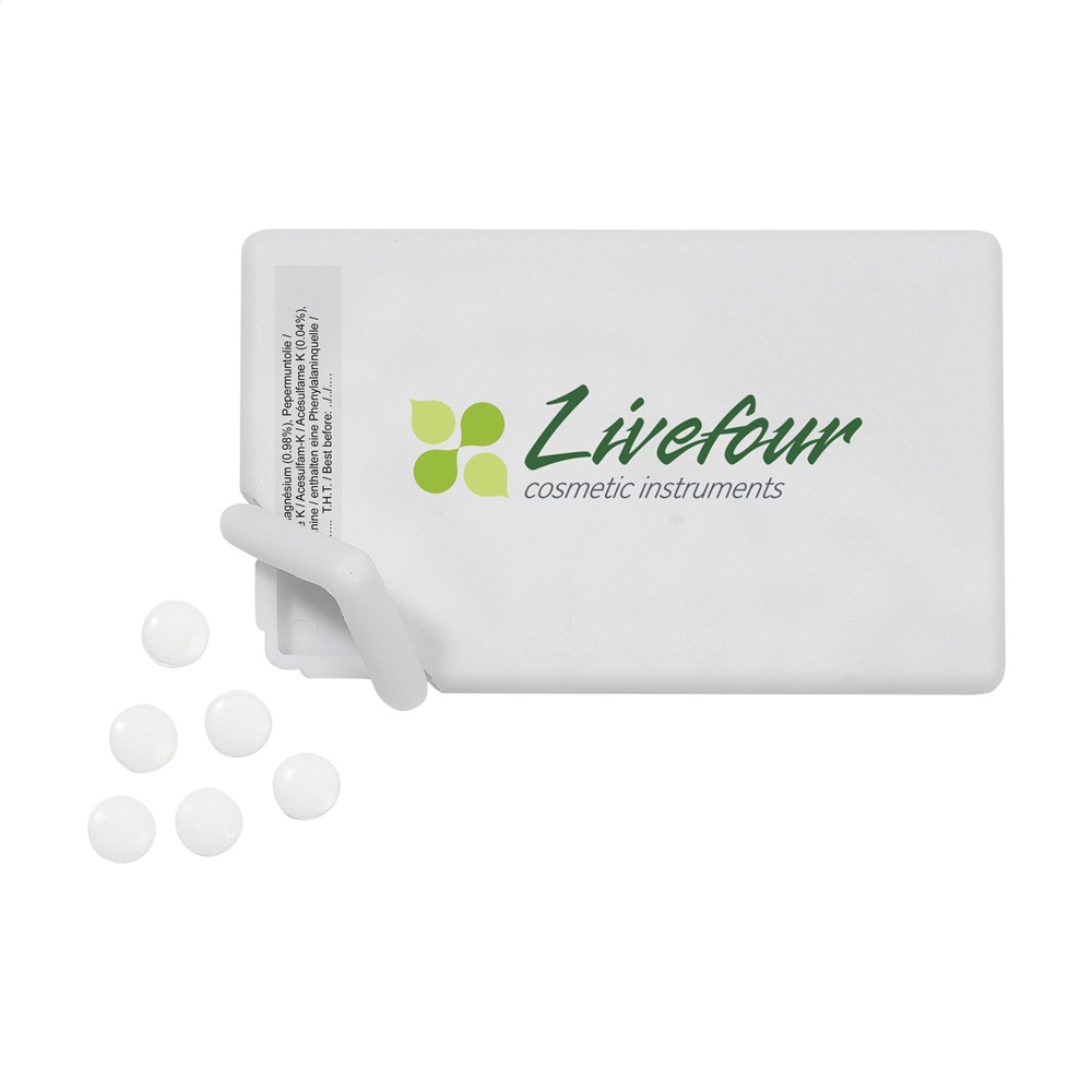 Dispenser met ca. 8 g (50 stuks) suikervrije pepermuntjes.meer