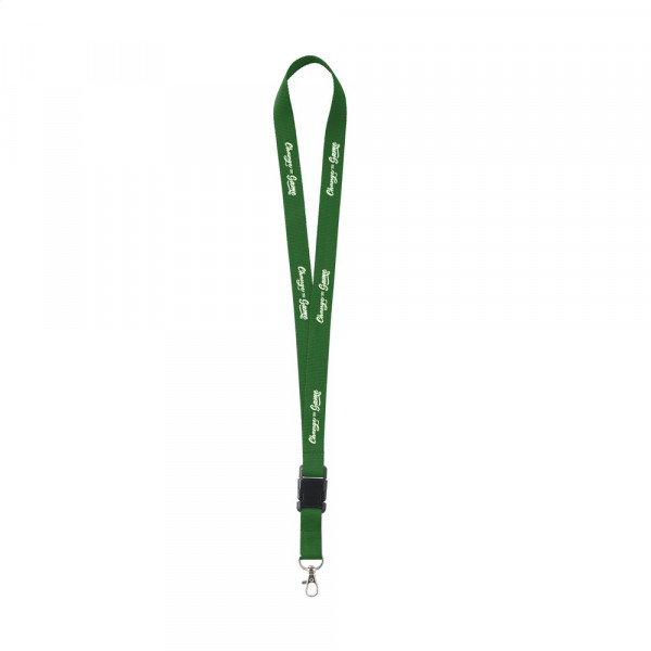 Lanyard van sterk geweven polyester met metalen karabijnhaak. Het onderste gedeelte is los te koppelen d.m.v. een kunststof kliksysteem.