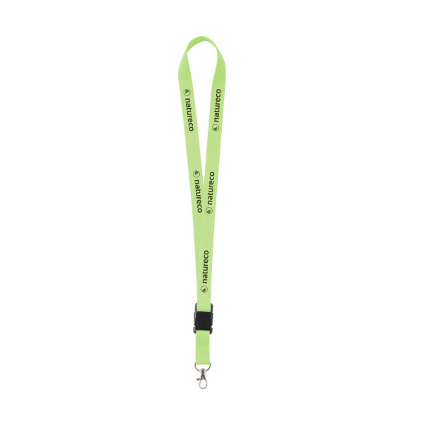Lanyard van sterk geweven polyester met metalen karabijnhaak. Het onderste gedeelte is los te koppelen d.m.v. een kunststof kliksysteem.