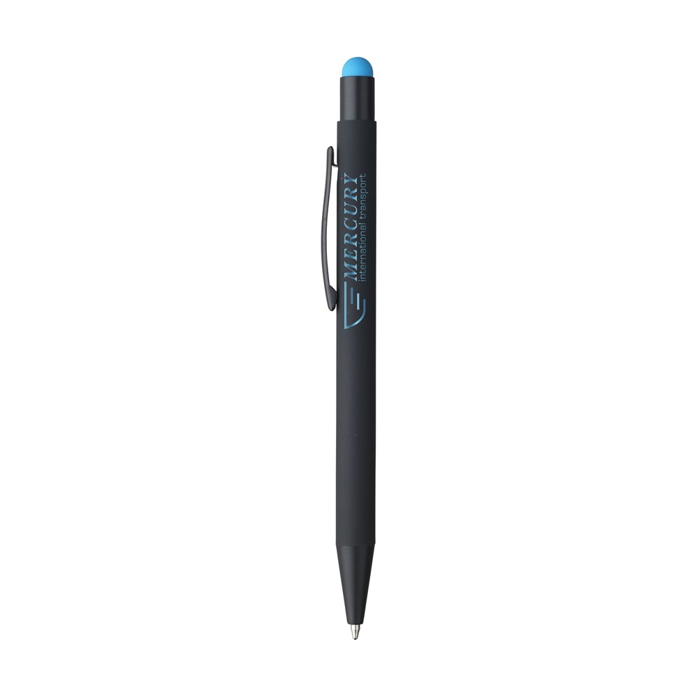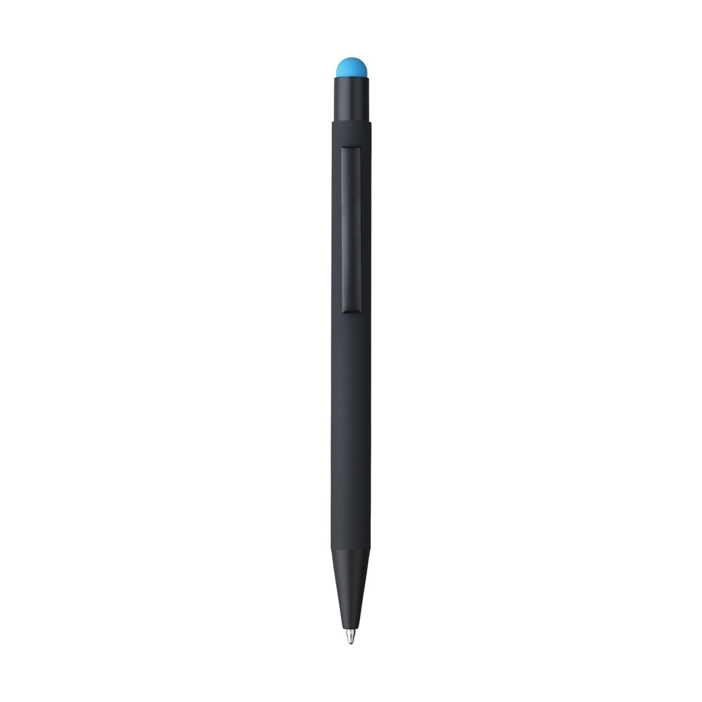 Slanke blauwschrijvende balpen met rubberized houder, matzwarte, metalen clip en gekleurde, rubberen top/pointer. Onder de rubberized finish is de houder voorzien van een speciale, gekleurde coating. Zodra het logo gelaserd wordt verschijnt deze gekleurde coating die matcht met de kleur van de pointer. Dit resulteert in een pen met een zeer chique uitstraling.