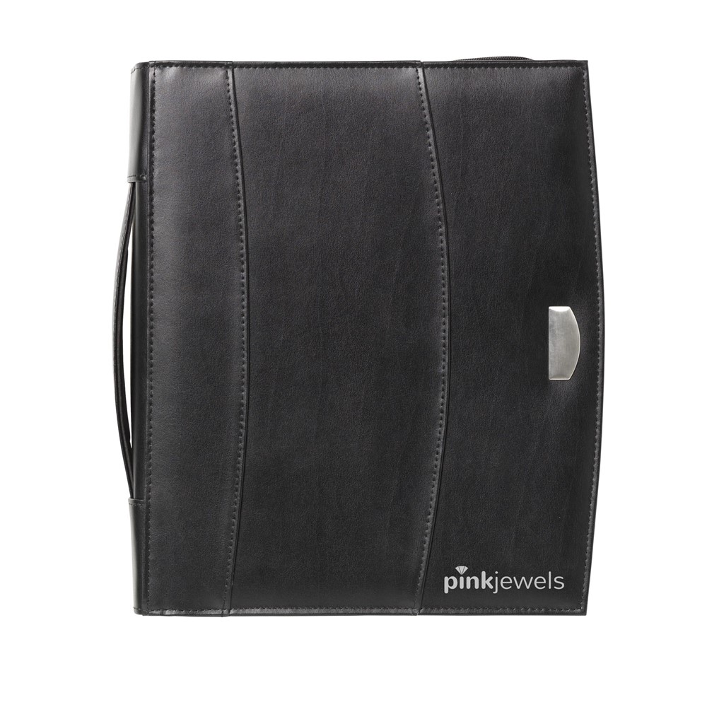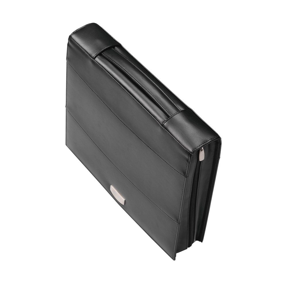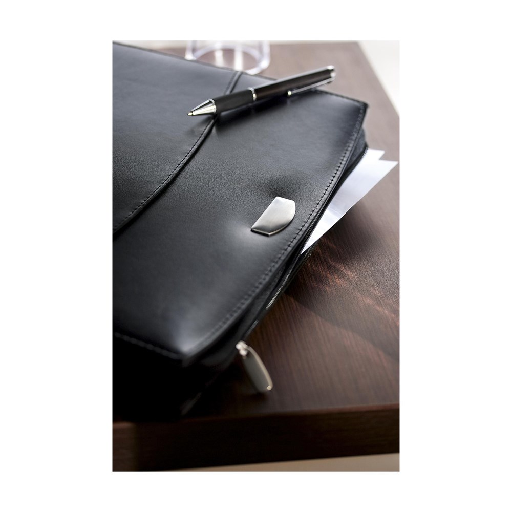 Schrijfmap/documentenmap van fijn gebonden leder in A4-formaat. Met handgreep, uitneembare ringband, dual power solarcalculator (incl. celbatterij) en rits rondom. Incl. schrijfblok en balpen. Per stuk in luxe geschenkdoos.