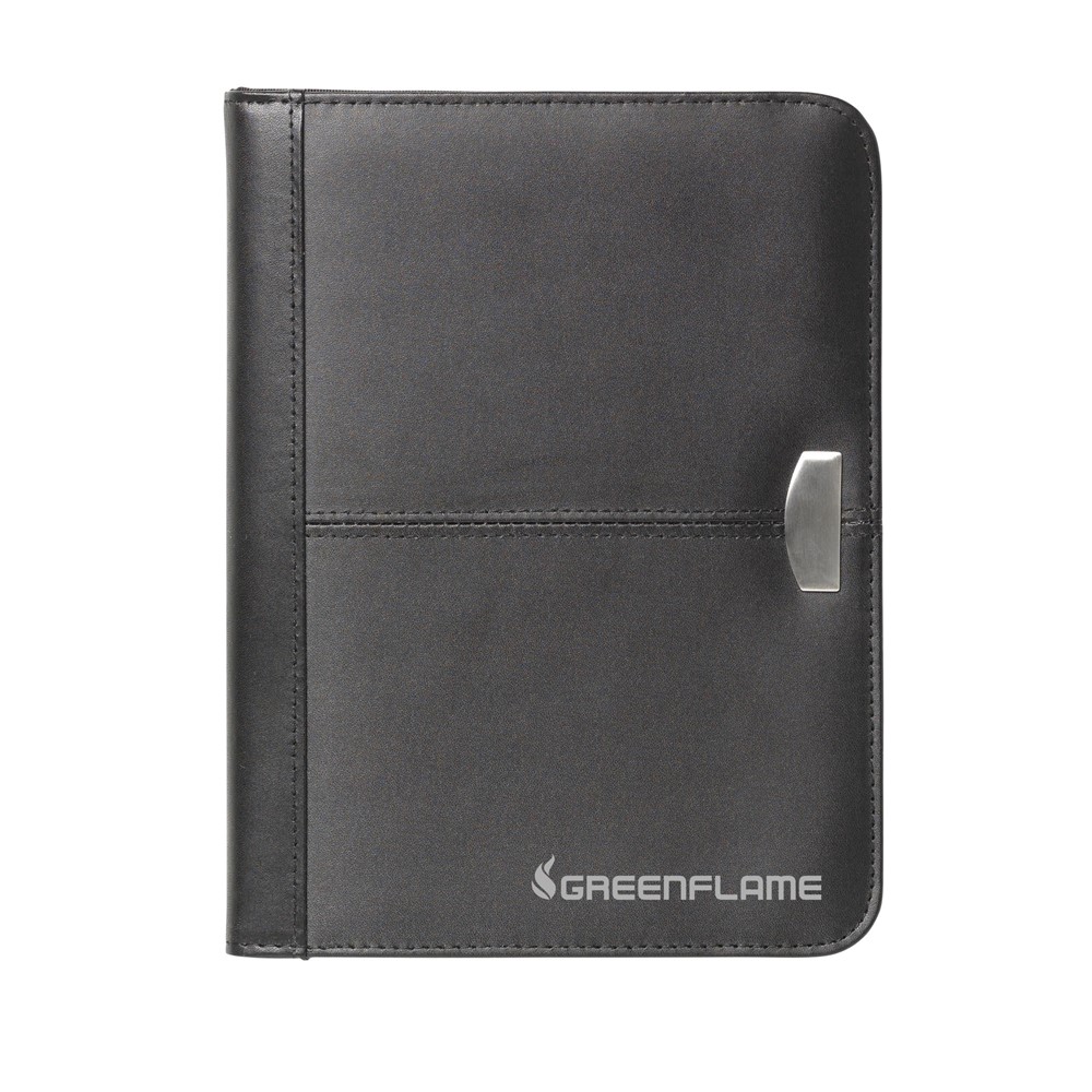 Schrijfmap/documentenmap van fijn gebonden leder, in A5-formaat. Met diverse insteekvakken en rits rondom. Incl. schrijfblok en balpen. Per stuk in luxe geschenkdoos.