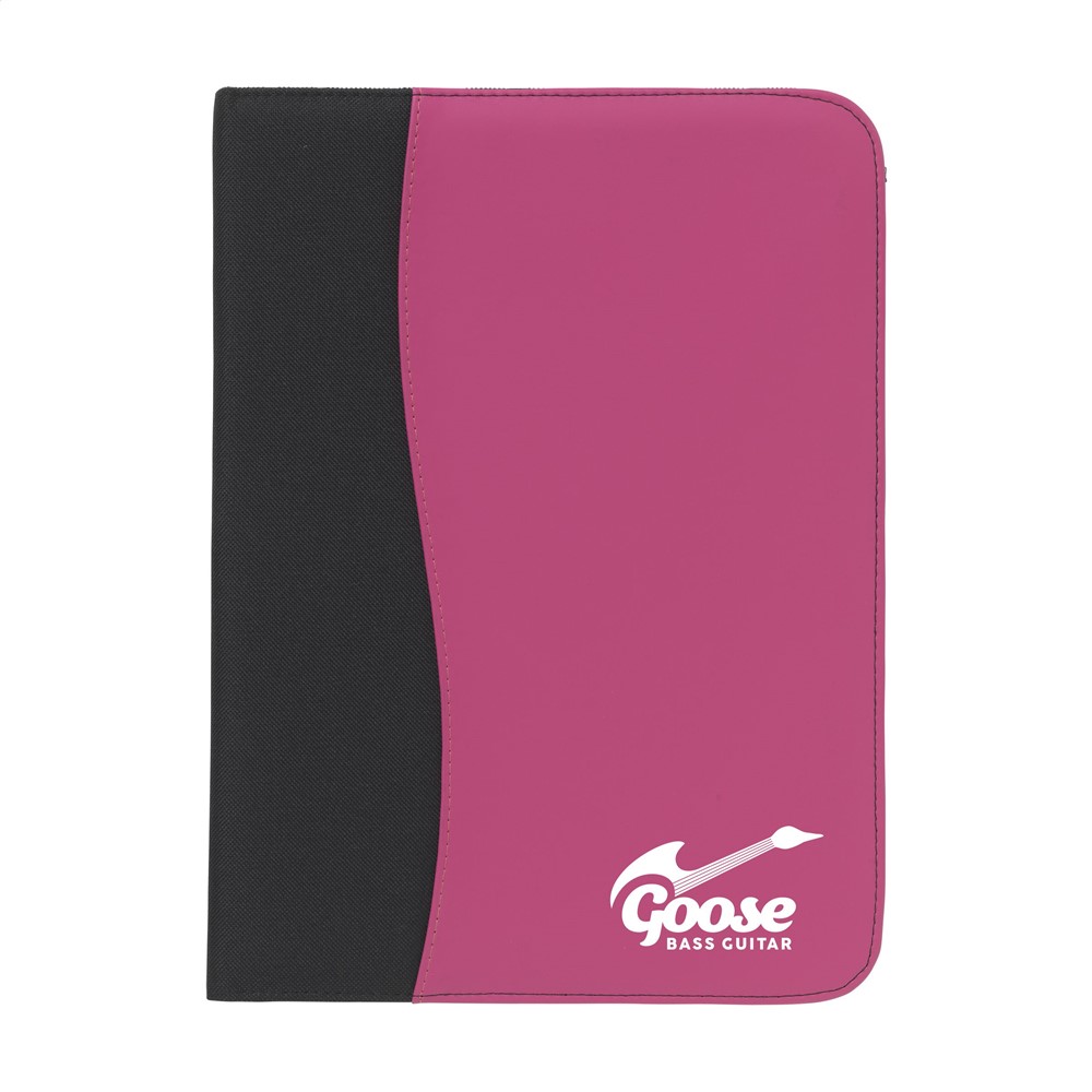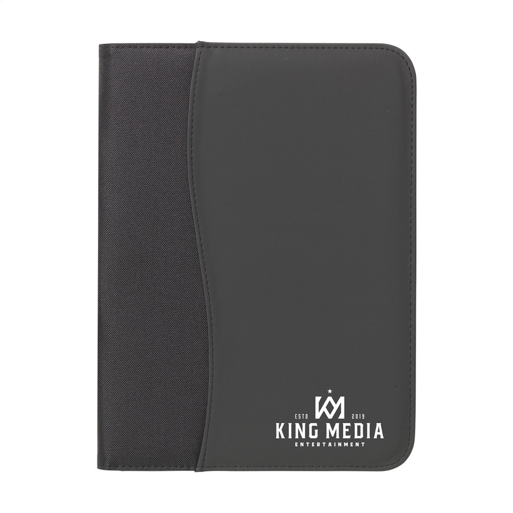 Schrijfmap/documentenmap van 600D nylon/imitatieleer in A4-formaat. Met diverse insteekvakken. Incl. schrijfblok en balpen.