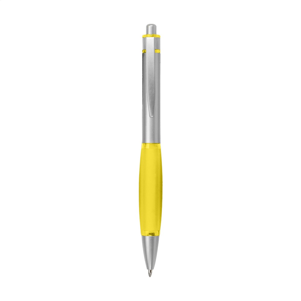 Blauwschrijvende balpen met gripvast, transparantgekleurd rubberen voorstuk, en metalen clip.