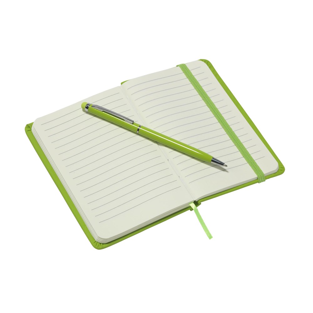 2-delige geschenkset: handzaam notitieboekje in A6-formaat, met ca. 96 vel gelinieerd, crèmekleurig papier, handige sluitelastiek en leeslint. Incl. bijpassende, zwartschrijvende touchscreen pen. Per set in doos.