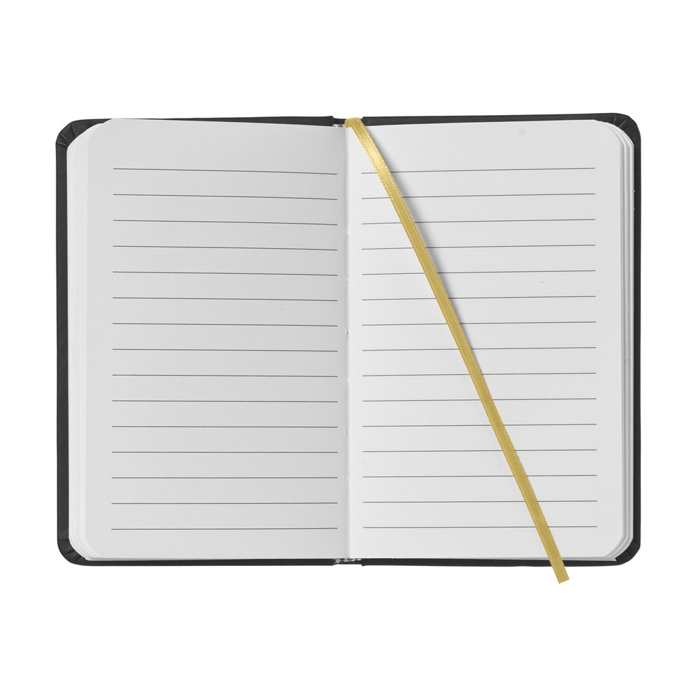 Praktisch en handzaam notitieboekje in A6 formaat. Met 80 vel crèmekleurig gelinieerd papier, stevige PU cover, elastische sluiting, gebonden rug en zijden leeslint.