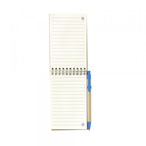 Milieuvriendelijk notitieboekje van gerecycled materiaal, met ca. 70 vel crèmekleurig gelinieerd papier en kartonnen omslag met elastische sluiting. Gebonden in een sterke, metalen wire-o-binding. Incl. blauwschrijvende balpen.