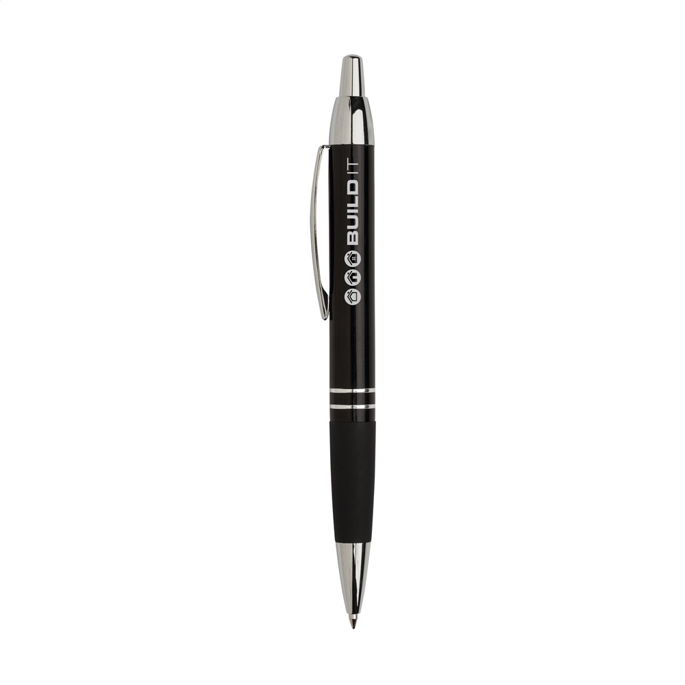 Blauwschrijvende, metalen balpen met hoogglans metallic look houder, gripvast, rubberen voorstuk, stevige, metalen clip en drukknop en zilverkleurige hoogglans accenten. Geef uw geschenk meer karakter met één van onze stijlvolle geschenkverpakkingen.