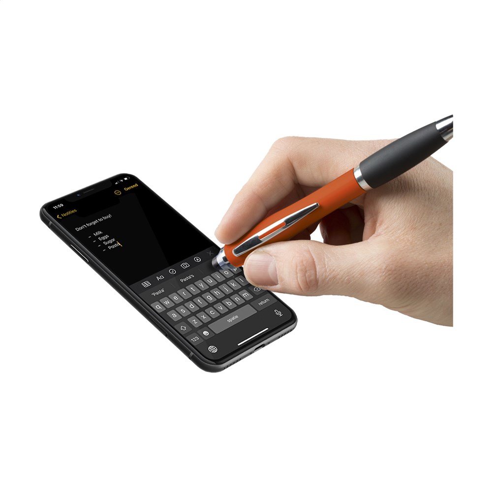 Blauwschrijvende balpen met houder in metallic look, gripvast, rubberen voorstuk, hoogglans accenten, uitsparing in metalen clip, rubberen top/pointer voor het bedienen van touchscreens (zoals iPhone/iPad).