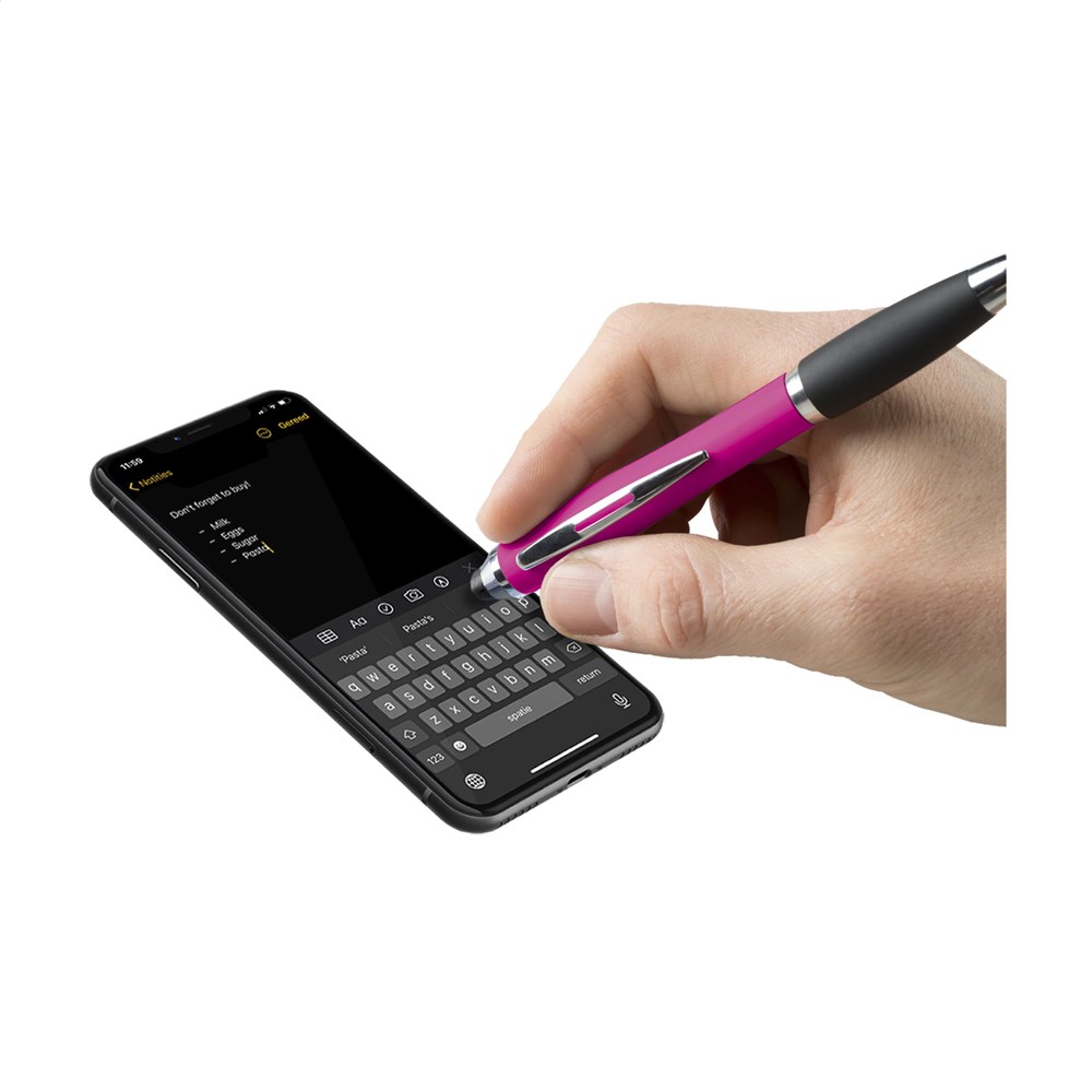 Blauwschrijvende balpen met houder in metallic look, gripvast, rubberen voorstuk, hoogglans accenten, uitsparing in metalen clip, rubberen top/pointer voor het bedienen van touchscreens (zoals iPhone/iPad).