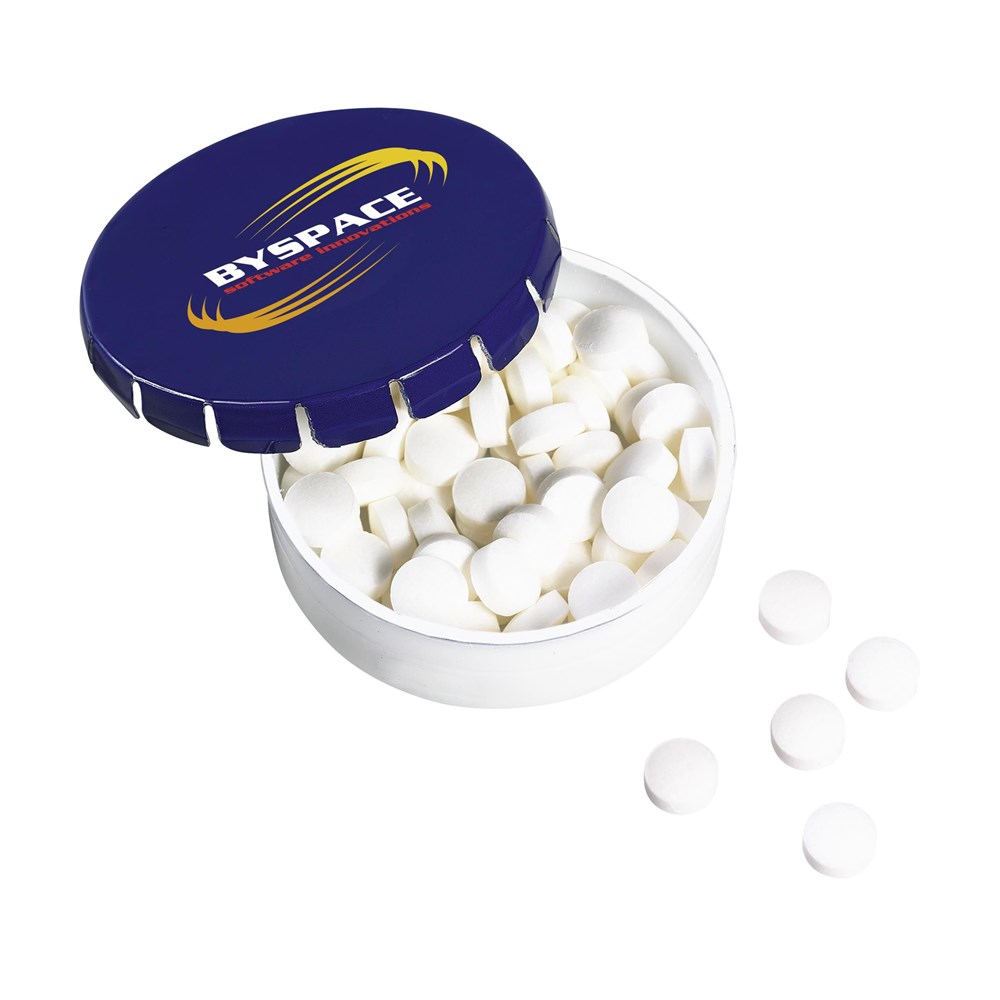 Kunststof uitdeeldoosje met metalen deksel en handig druk-/kliksysteem. Gevuld met ca. 12 g (75 stuks) suikervrije pepermuntjes. Opdruk in full colour (digitaal) is niet mogelijk op het witte en zilverkleurige blikje (artikelnrs. resp. 3623.10/3623.01).