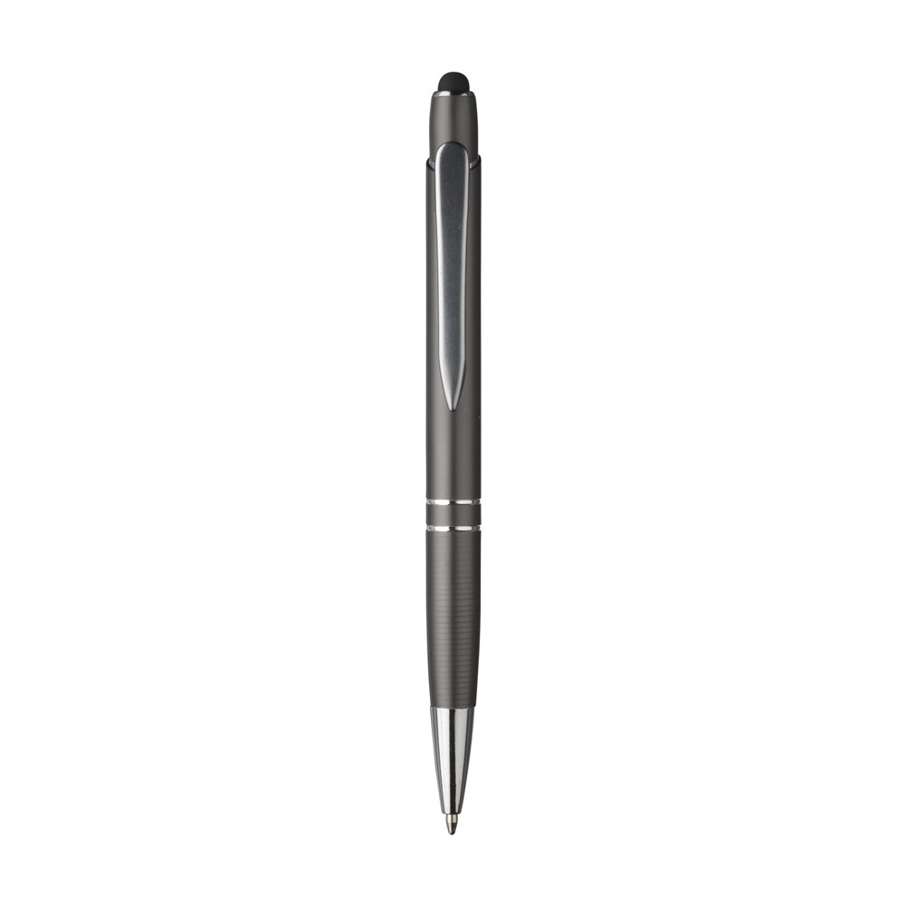 Blauwschrijvende pen met aluminium houder met gripvast voorstuk, zilverkleurige accenten en metalen clip. Voorzien van een top/pointer voor het bedienen van touchscreens (zoals iPhone/iPad).