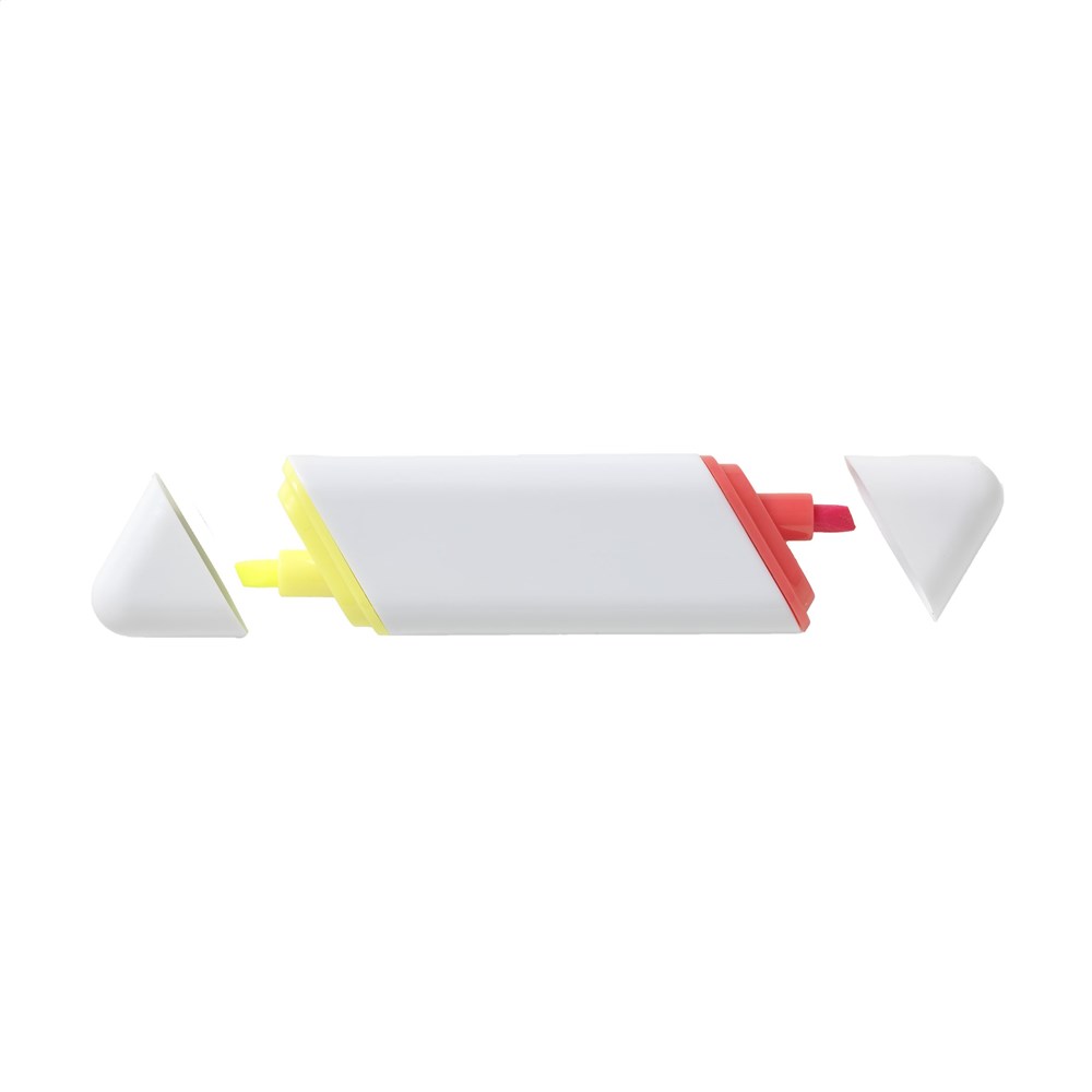 Markeerstift met 2 verschillende fluorescerende kleuren en beitelpunt met 2 schrijfbreedtes.